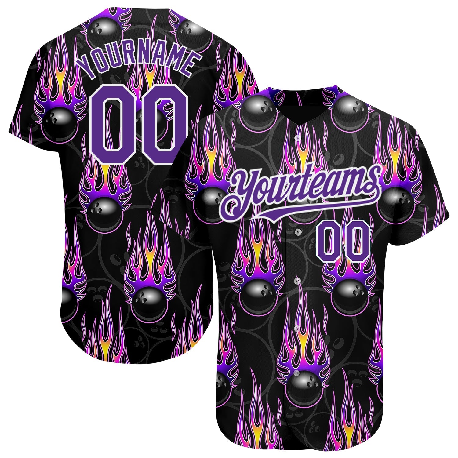 Custom Black Purple-White 3D Pattern Design Bowling Ball With Hotrod Flame Authentic Baseball Jersey